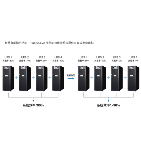 • 智慧負載均分功能:100-200kVA 機型能夠維持系統運作在高效率負載點。