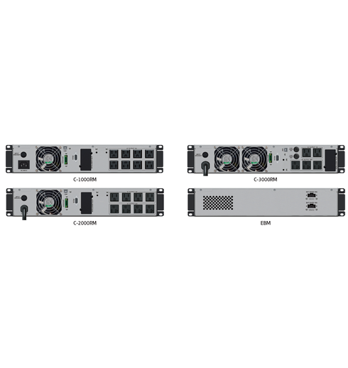 • 高輸出功率因數: 0.9 輸出功因,提供更高的有效功率(Watt),例如 C-1000RM 為 1000VA/900W,C-3000RM 為 3000VA/2700W。